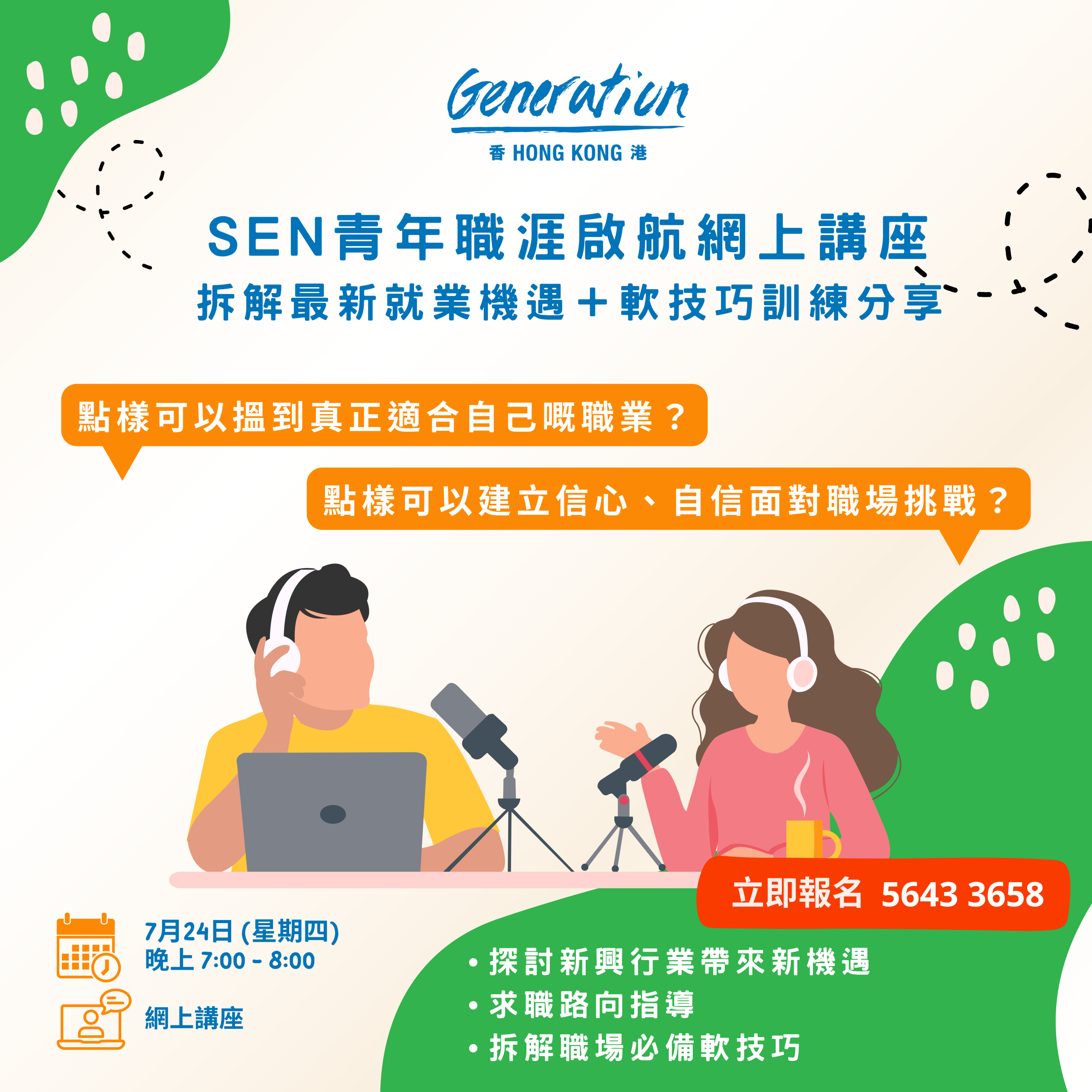 Generation 誠意邀請你參加【SEN青年職涯啟航】網上講座,一齊探索新機遇,陪伴你關心嘅年青人展翅高飛!